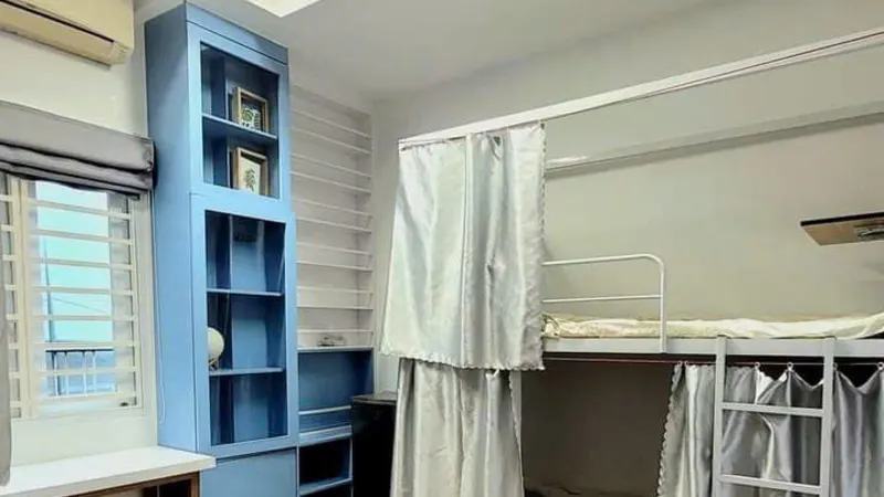 - Giường nệm riêng tư kèm kệ bàn học.
