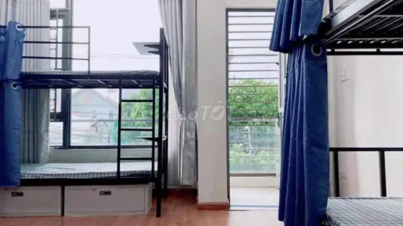 - Phòng ngủ: Máy lạnh thoải mái, trang bị đầy đủ với giường niệm, rèm che, bàn học gấp gọn và tủ đồ cá nhân cho mỗi người 🛏️🪑